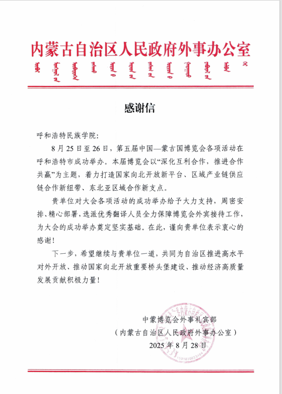 8月25日,第五届中国—蒙古国博览会在呼和浩特开幕,我校外国语学院教师包金兰、商学院教师巴达拉夫在会议期间担任翻译,来自多个专业的60余名学生担任志愿者,他们以扎实的专业能力、饱满的服务热情和严谨的工作态度,在多项重要活动中承担志愿服务与会务支持工作,为推动中蒙交流合作贡献力量。内蒙古自治区人民政府外事办公室中蒙博览会外事礼宾部向我校发来感谢信,对我校志愿者在博览会期间的突出贡献予以高度认可。