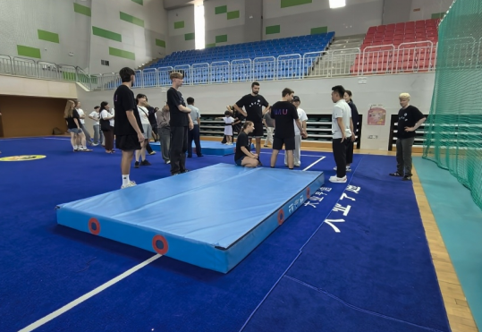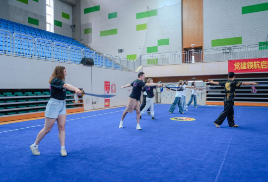 在拳脚间体悟文化精神。体育学院的传统武术体验则让访问团感受到中华文化的力量之美。院长乌日根牧仁与教师王志飞系统解读武术文化后,体育学院学生的一场刚柔并济的武术表演震撼登场。访问团师生被招式中的力道与韵律深深吸引,纷纷向武术专业学生请教剑术技法、腾空翻要领等经典动作。在一招一式的学习中,他们不仅感受到武术的力量美学,更体悟到自强不息、以和为贵的中华传统精神内核。