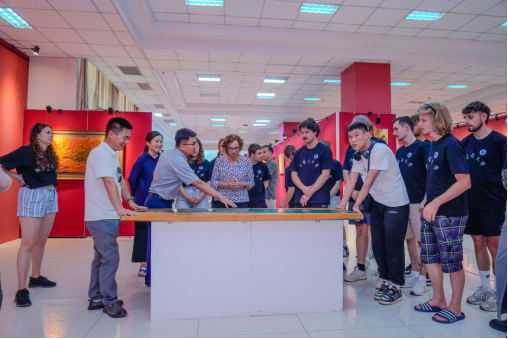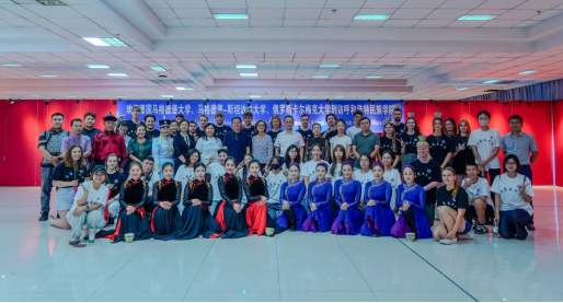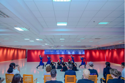 在歌舞中触摸文化共鸣。音乐与舞蹈学院师生率先为访问团带来沉浸式文化体验。随着副院长韩木兰对传统舞蹈、乐器及民歌的生动讲解,我校师生表演的《万丽》《敬》《盅碗筷组合》等民族舞蹈轮番上演,舞姿灵动间尽显草原风情;马头琴名曲《初升的太阳》悠扬婉转,长调《盛世太平》高亢辽远,让访问团师生沉浸在北疆音乐的辽阔意境中。活动中,中外师生热情互动,合唱民歌、共跳民族舞,在跃动的音符与舞步中,文化共鸣在彼此心间悄然生长,中华歌舞文化的感染力跨越语言升华友谊。