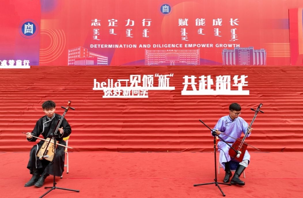 迎新现场,马头琴齐奏、歌舞表演轮番上阵,非遗艺术品琳琅满目,营造了浓厚的校园文化氛围。