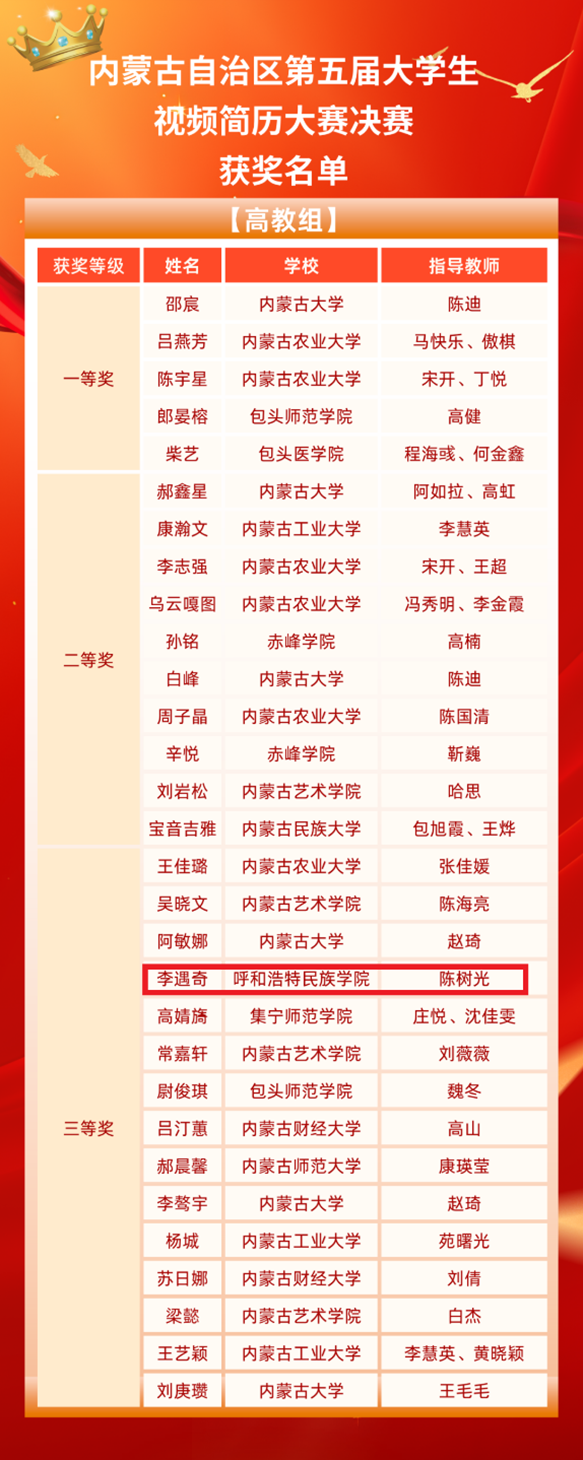 近日,由内蒙古自治区教育厅高校学生就业创业服务中心主办的内蒙古自治区第五届大学生视频简历大赛决赛落下帷幕,北疆就业咨询客户端公布了获奖名单,我校学生荣获高教组三等奖。