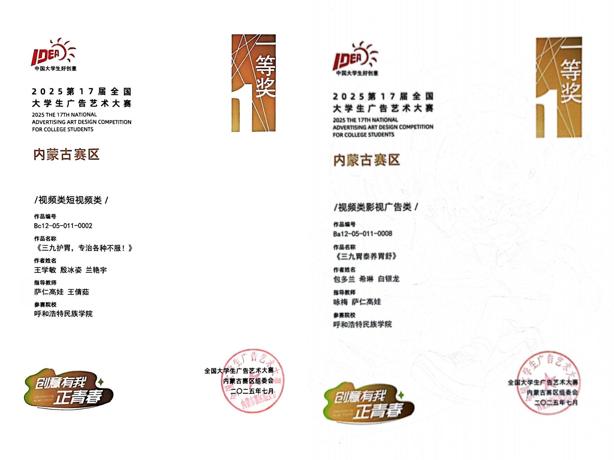 近日,我校新闻传媒学院学生在“中国大学生好创意”第17届全国大学生广告艺术大赛中取得佳绩。2023级新闻学班包多兰团队斩获全国优秀奖;王学敏团队《三九胃泰,专治各种不服!》与包多兰团队《三九胃泰养胃舒》双双荣获内蒙古赛区一等奖,樊欣团队《我们这一“袋”》获三等奖,霍启光、闫欣等十名同学获自治区优秀奖。此前,2022级新闻学班张丹团队也在第十九届全国数字艺术设计大赛中夺得内蒙古赛区三等奖。