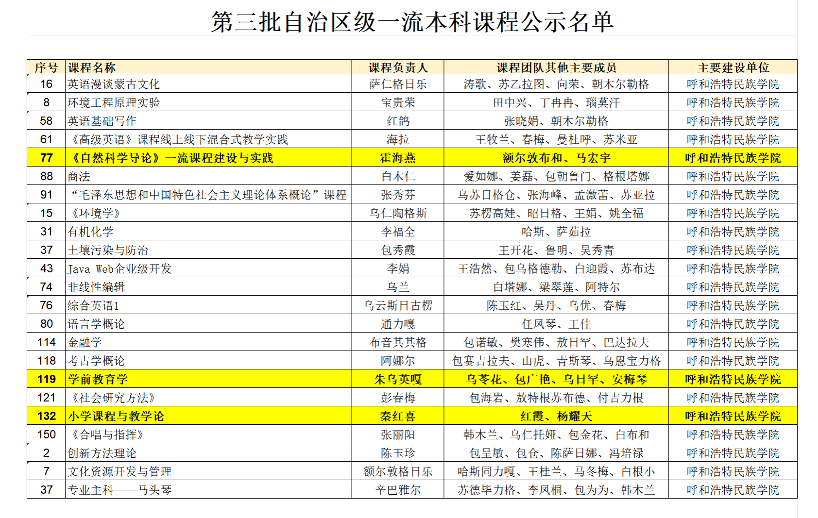 建设国家级一流课程《小学教育学》及自治区级一流课程《小学课程与教学论》《教育学原理》《自然科学导论》《学前教育学》等5门精品课程。形成基础理论+实践能力+创新素养的课程群体系,为边疆地区基础教育人才培养提供核心支撑。