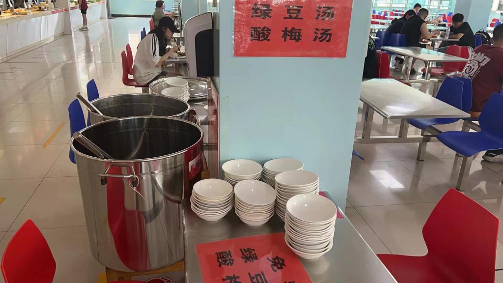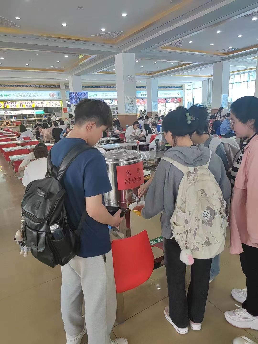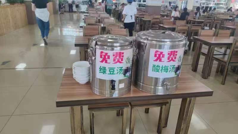 在深入开展主题教育之际,学校后勤管理处紧密围绕服务师生这一根本任务,真抓实干,努力把学习教育成果转化到提升服务、推动发展工作中来。 天气逐渐炎热,伴有连续的高温,为了做好防暑工作,更好地服务学校广大师生。学校后勤管理处餐饮服务中心全体员工为表达对师生的关心,帮助师生抵抗高温,6月6日开始,学校南、北食堂每一个楼层为师生们免费提供绿豆汤和酸梅汤饮用。在这炎炎夏日带给师生们一丝“清凉”和满满的爱意。