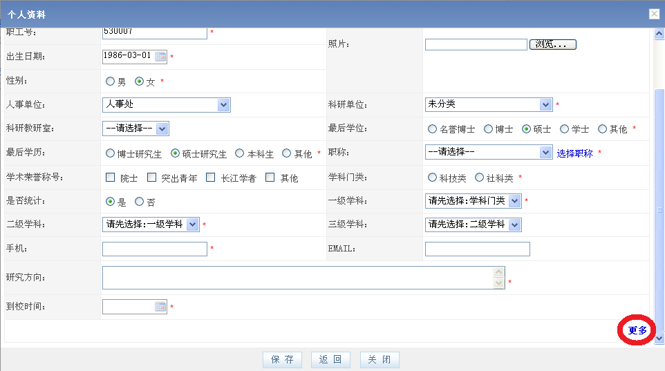 1.填写流程:用IE、360浏览器打开开云手机站官方版在线登入科研管理系统(科研管理系统网址:http://211.82.176.56:8081,打开后请先刷新,默认用户名是教师工号)。单击右上角“个人资料”->单击“编辑”按钮->输入信息->单击“更多”->输入信息->单击“保存”按钮,完成。