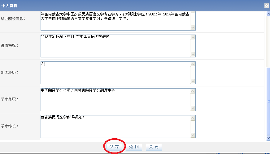 学术兼职:示例“中国翻译学会会员;内蒙古翻译学会副理事长”,中间用分号分割;没有学术兼职情况,填写“无”;