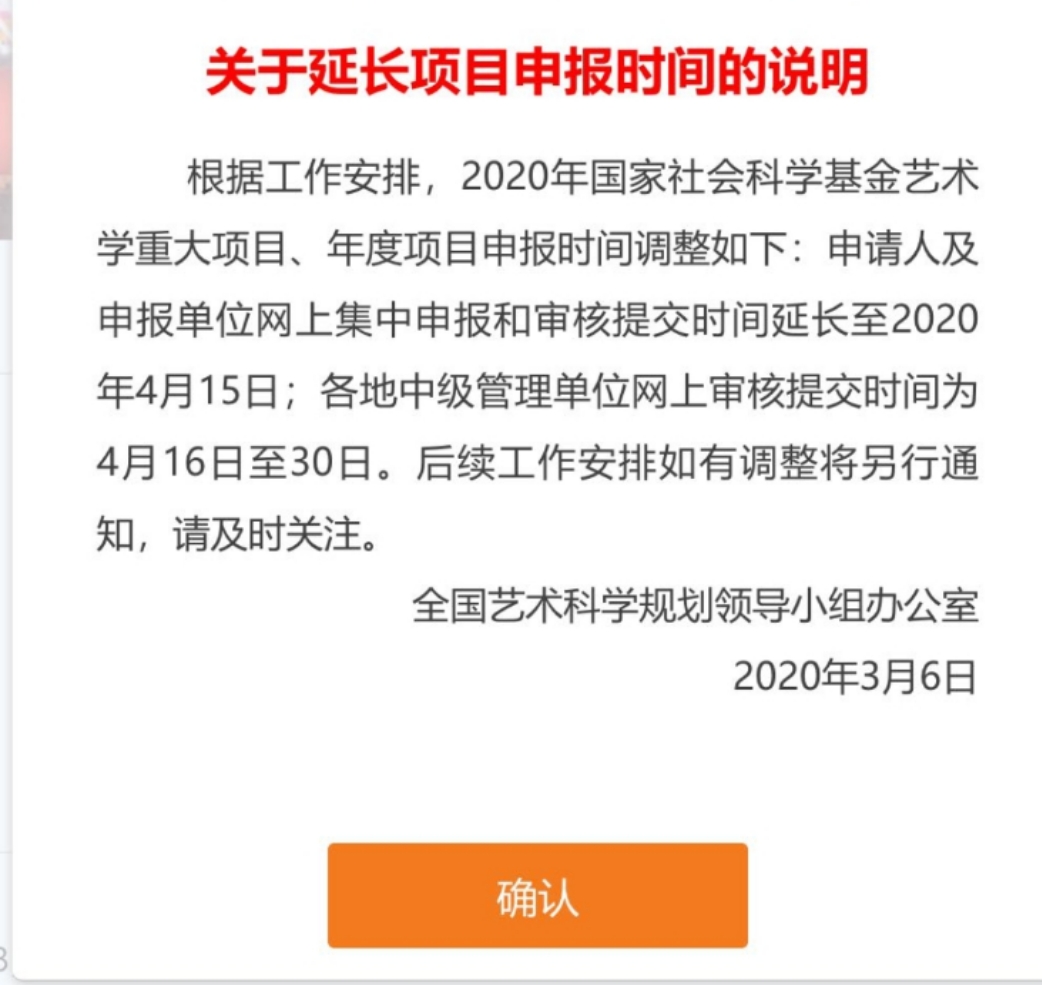 根据全国艺术科学规划领导小组办公室工作安排,2020年国家社会科学基金艺术学重大项目、年度项目申报工作延期,具体截止日期如下图所示。