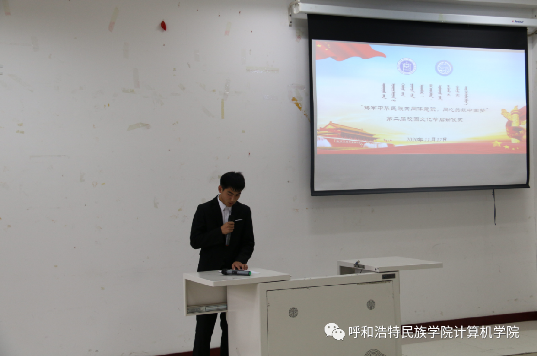 本次开幕式的主持人由院学生会主席孙国龙担任。党总支部副书记赛希雅拉图老师、计算机学院学工办辅导员包巴雅力格老师、计算机学院学工办辅导员芒来巴达日老师、院学生会主席团、院学生会各部门部长、各班级班长及团支书齐聚一堂,共襄盛典。