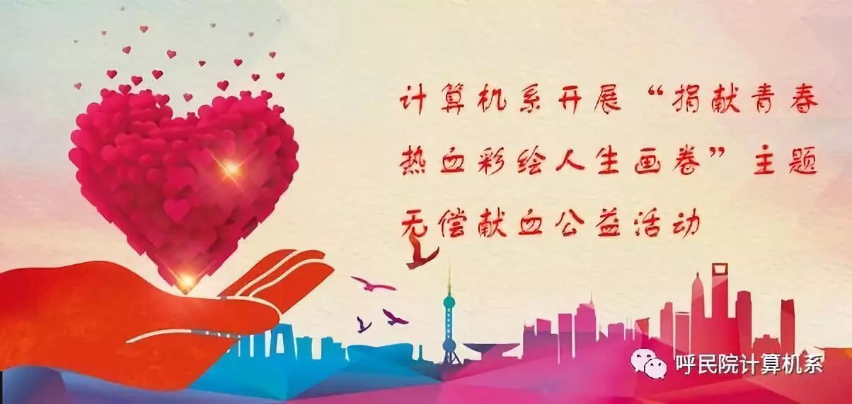 2019年4月9日,计算机系联合内蒙古血液中心开展了“捐献‘青春热血’,彩绘人生画卷”主题无偿献血公益活动。本次活动在一号公寓前进行,以爱心彰显青春之美,在校园内掀起了一场无偿献血热潮。