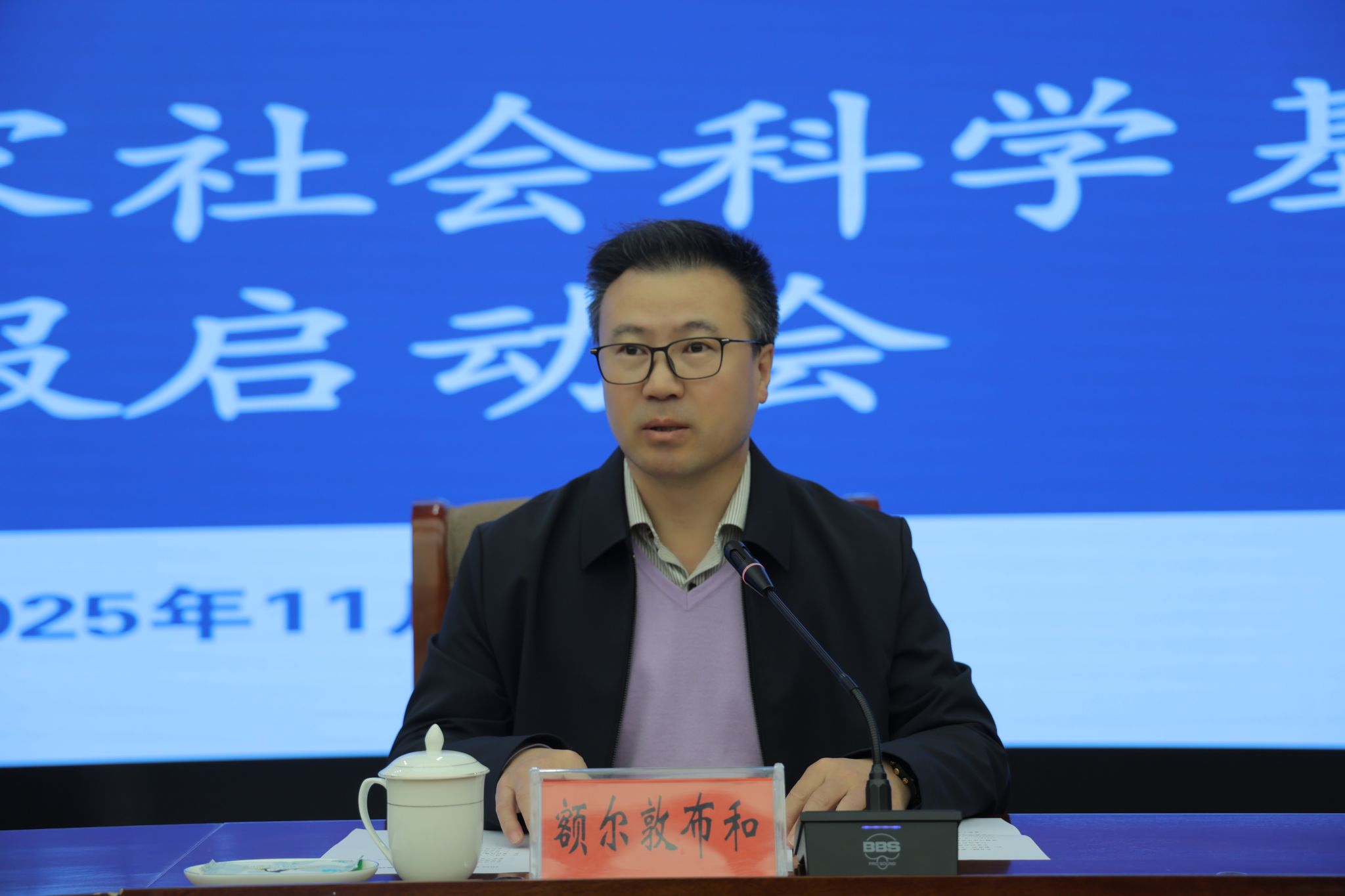 在项目启动会上,额尔敦布和作动员讲话。他强调,国家社科基金项目对推动学校学科建设、促进教师科研成长具有重要意义,并鼓励与会教师珍惜此次学习机会,认真吸收专家经验,积极申报项目,切实提升科研创新能力,以更好服务国家战略发展需求。