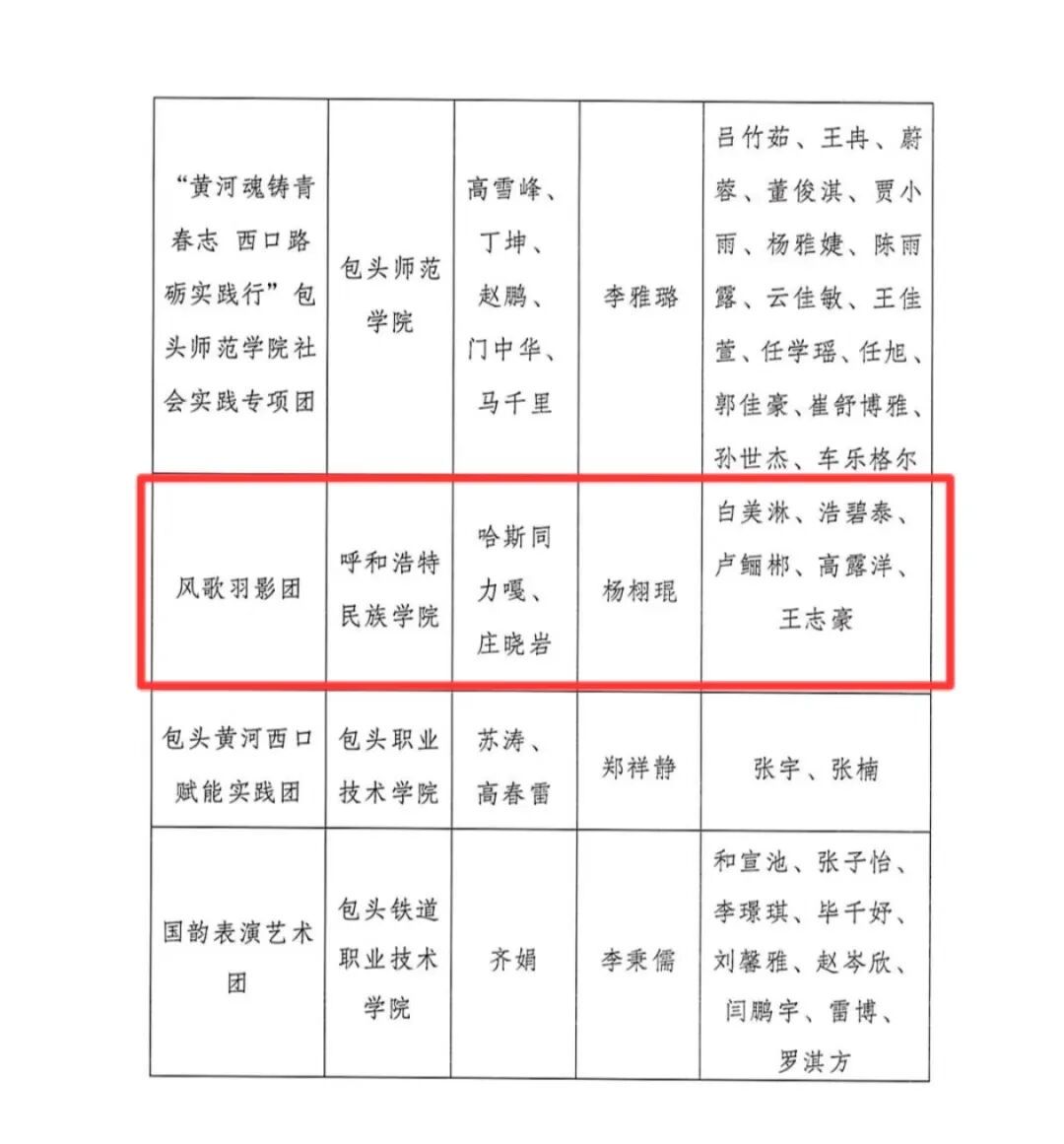 近日,我校“风歌羽影团”社会实践团队实践报告被共青团包头市委员会评为2025年全国大学生暑期文化科技卫生“三下乡”社会实践内蒙古“亮丽北疆·一城一榜”专项活动包头市优秀课题实践成果报告,彰显了我校学子在文化传承与社会实践领域的卓越风采。