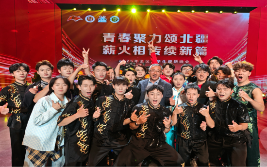 演出结束后,李云峰处长对节目给予充分肯定,既赞扬武术队学子的专业素养与精神风貌,也认可王志飞老师的专业指导成果,评价该节目“既展现了体育育人成效,也为全区大学生迎新晚会增添了亮眼色彩”。他还特意与武术队全体成员亲切合影,对师生们的精彩表现表示祝贺。