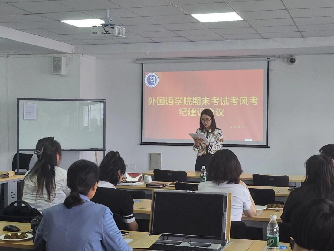 6月14日,外国语学院召开了期末考试考风考纪建设会议,外国语学院副院长秦红喜、副院长红鸽以及全体教职工参与了此次会议。