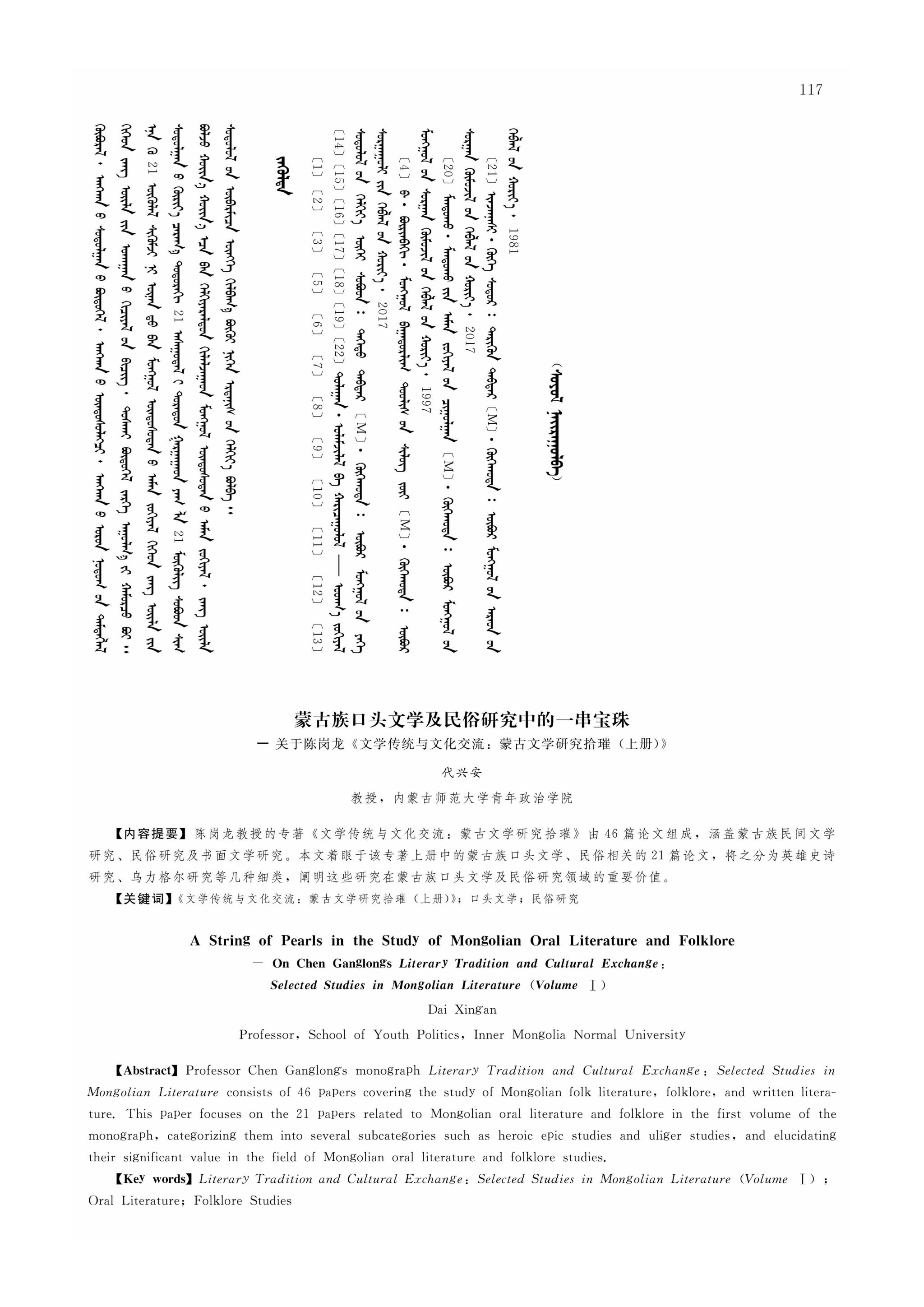 蒙古族口头文学及民俗研究中的一串宝珠——关于陈岗龙《文学传统与文化交流:蒙古文学研究拾璀(上册)》